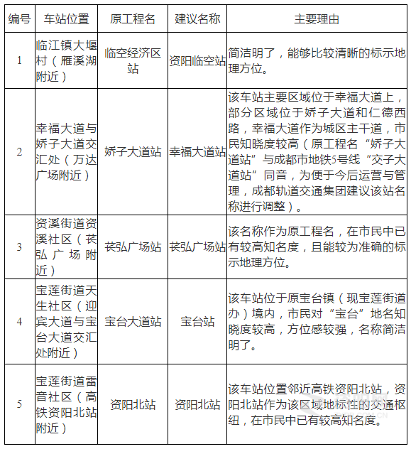轨道交通资阳线(资阳境内)车站命名方案(征求意见稿)