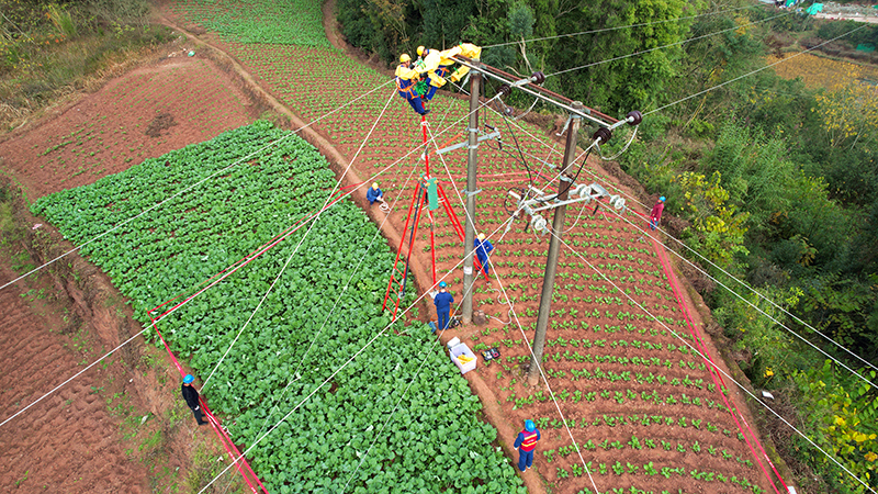 四川新闻网消息 12月12日,在资阳市安岳县元坝镇天王村电网施工现场,国网资阳供电公司配网带电作业班人员正在田间地头使用“蜈蚣梯”开展带电作业,尽量降低因停电给农村居民和农村经济发展带来的损失。