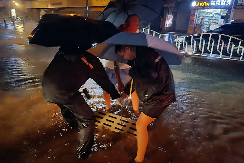 | 市政人员正在对城区堵塞的排涝口进行疏通作业(安岳县综合行政执法局供图) |