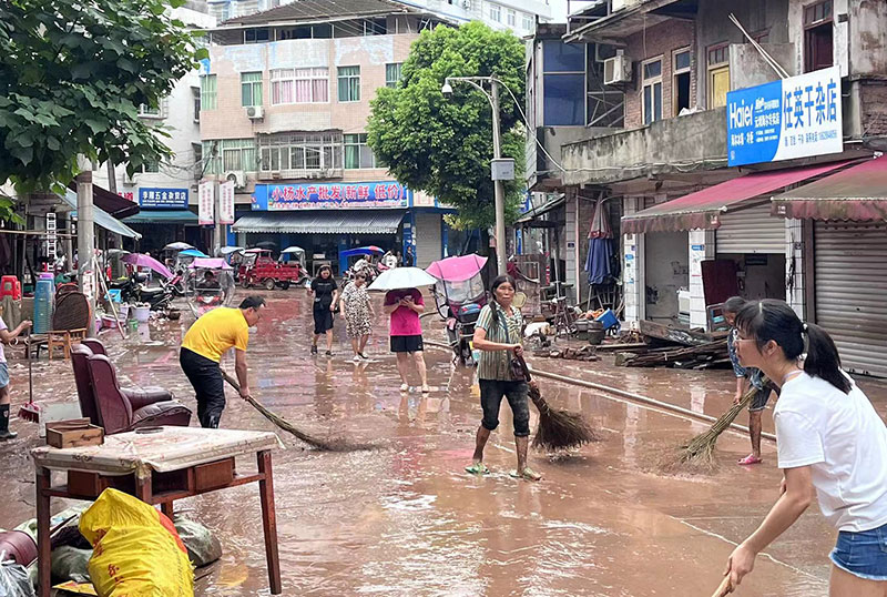 | 元坝镇镇村干部正在清理街道内涝积水(元坝镇供图) |