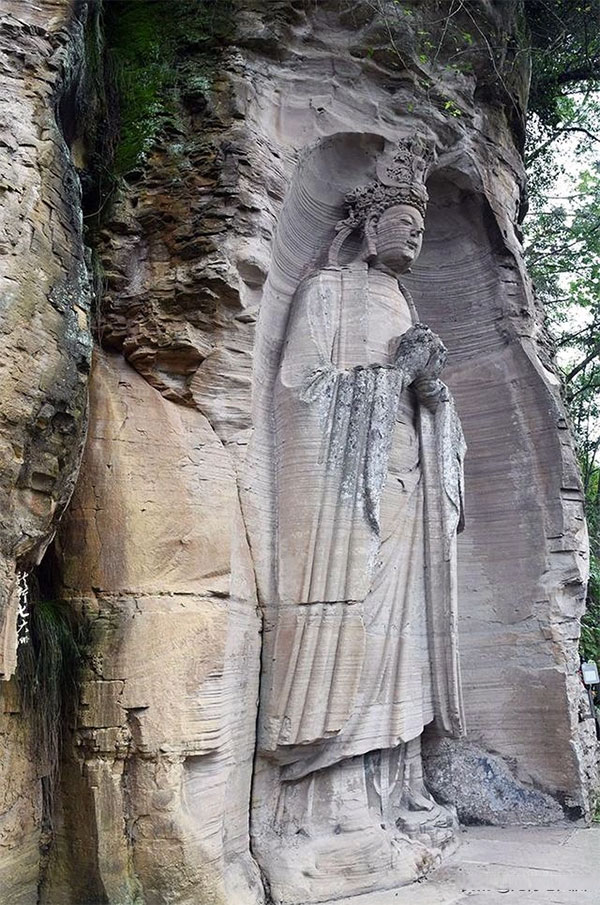 在资阳市安岳县千佛寨,几尊佛像并排而立,这是视频中所提到《黑神话:悟空》在安岳的另一处取景地。千佛寨位于安岳县城西北2.5公里的大云山上,因崖壁上雕刻有大小佛像3千余尊而得名。早在2006年5月25日,已被国务院公布为第六批全国重点文物保护单位。
