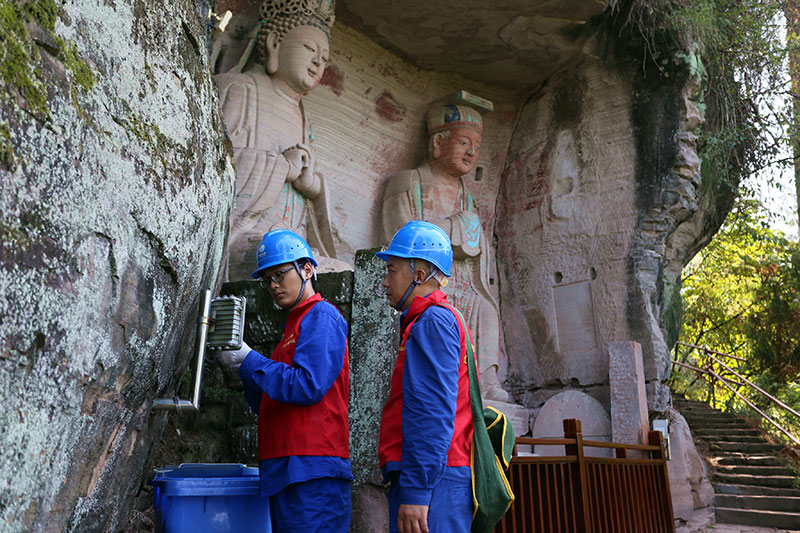 9月12日,在位于安岳县石羊镇顶新社区的茗山寺山巅,迎面望见一尊头戴宝冠、身披袈裟、双手结印的摩崖石刻造像,这尊茗山寺的毗卢遮那佛像正是游戏《黑神话:悟空》中的取景地之一。为保障中秋节期间景区旅游高峰期的电力供应,国网四川电力(资阳安岳)连心桥共产党员服务队正在对寺庙进行全方位安全用电检查。