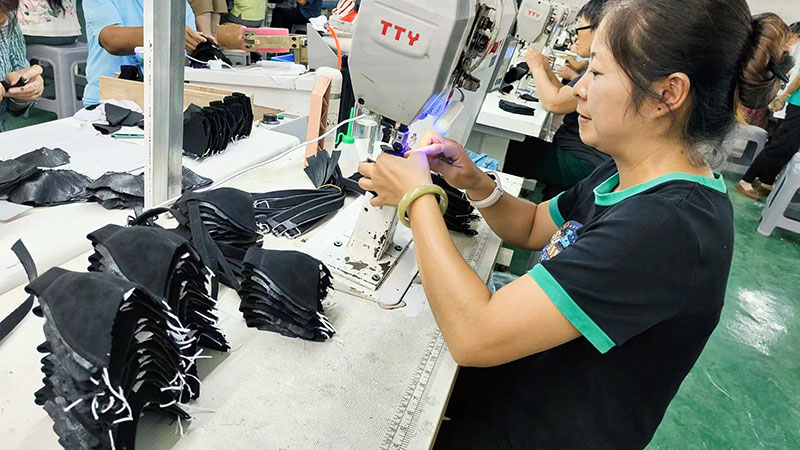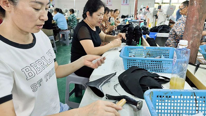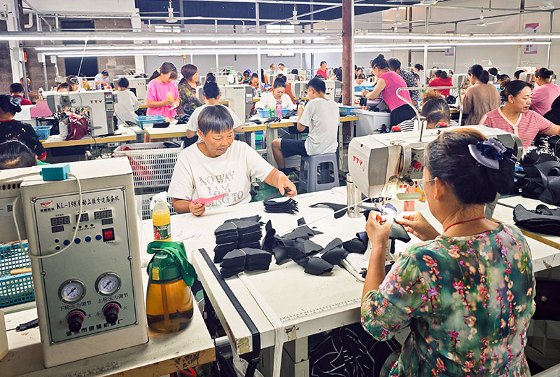 | 工人们正在工位上进行鞋面加工(驯龙镇供图) |