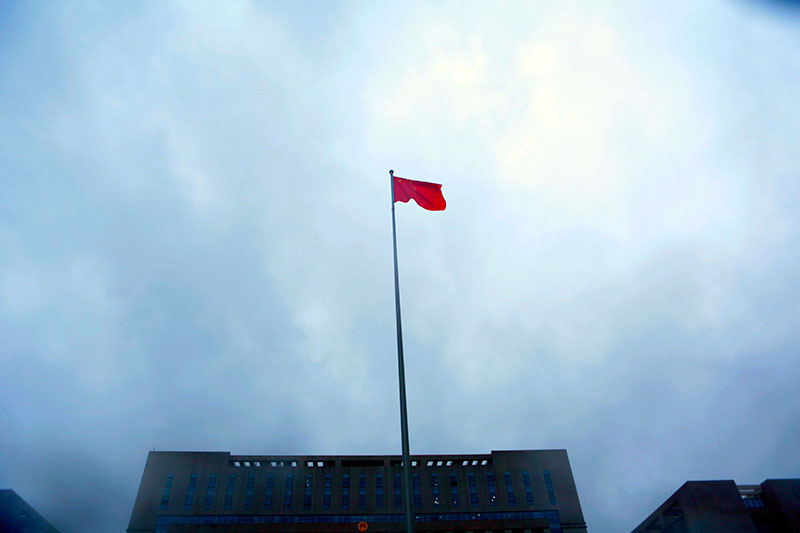 | 国旗在雨中高高飘扬(袁芳 摄) |
