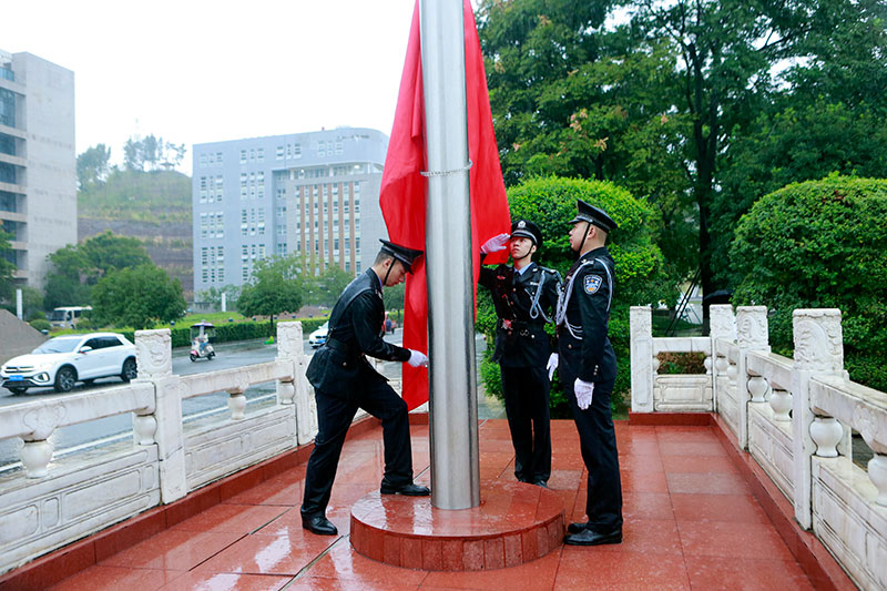 “升国旗仪式正式开始,全场肃立,迎国旗。”8时整,随着一声响亮的指令,3名护旗队员护卫着国旗,在雨水中坚定地向升旗台走来。他们的步伐铿锵而有力,每一步都踏出了对祖国和人民的无限忠诚与热爱。