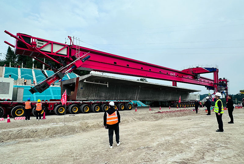 为确保新型40米箱梁顺利架设,中铁五局首次采用了国内先进的JQSD1000架桥机和YLFS1000E运梁车,较传统架桥机跨度更大、额定起重量更重,多种传感器和自动化监测控制系统可与数智梁场管理系统实时交互关联、实时监控及实时安全预警,具有安全系数高、性能稳定、施工效率高的显著优势。