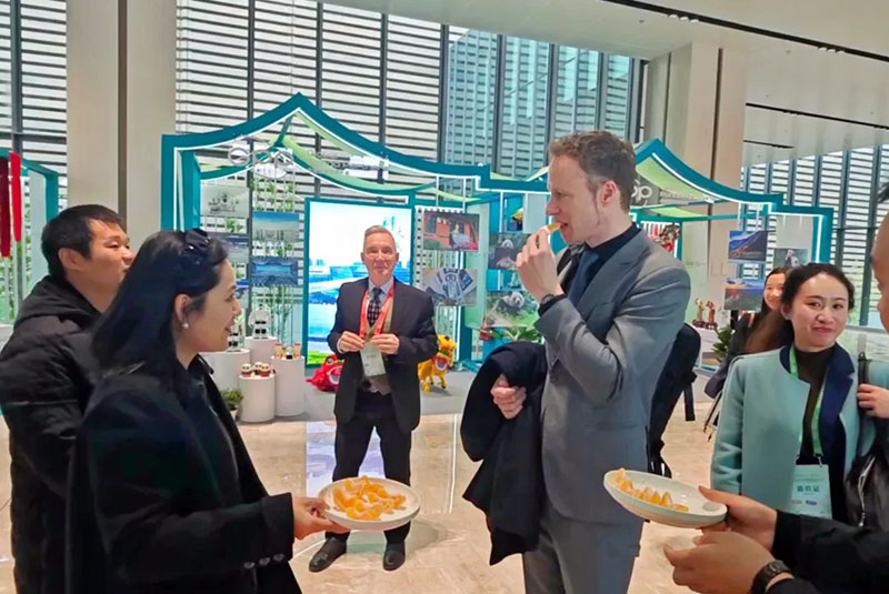 展位现场,甜蜜诱人的蜜柑吸引了国内参观人员与国际友人前来品鉴,在品尝之后,大家纷纷赞不绝口。除了蜜柑以外,瓶内画、东峰剪纸、宝莲酒等特色产品也参展亮相。