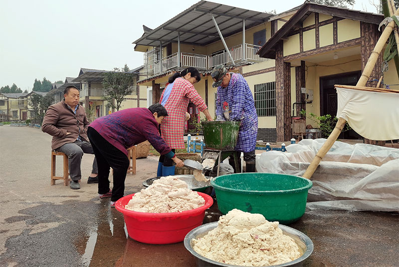 11月23日,在雁江区保和镇黄谷村三组聚居点,几位村民正在打红薯,过滤红薯粉。村民刘菊容介绍,她家每年自制红薯粉,过去全靠自己动手,而现在邻居们都会主动来帮忙。
