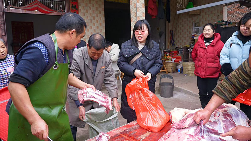 朝阳洞村第一书记龙远航站在一旁,帮着王建打包猪肉,他介绍道:“我们希望通过‘以购代扶’的方式,不仅让脱贫户得到了实惠,能过个幸福年,也让他感受到来自帮扶单位的温暖和关怀。”