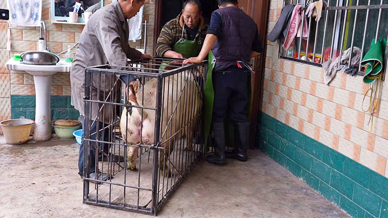 12月30日,资阳市安岳县朝阳镇朝阳洞村热闹非凡。在脱贫户王建家的院子里,一头头膘肥体壮的生猪正在驻村工作队的帮助下,被指引上秤、过磅、称重,然后生火、烧水、烫猪毛、分割猪肉……杀猪师傅手法娴熟,现场一派繁忙景象。