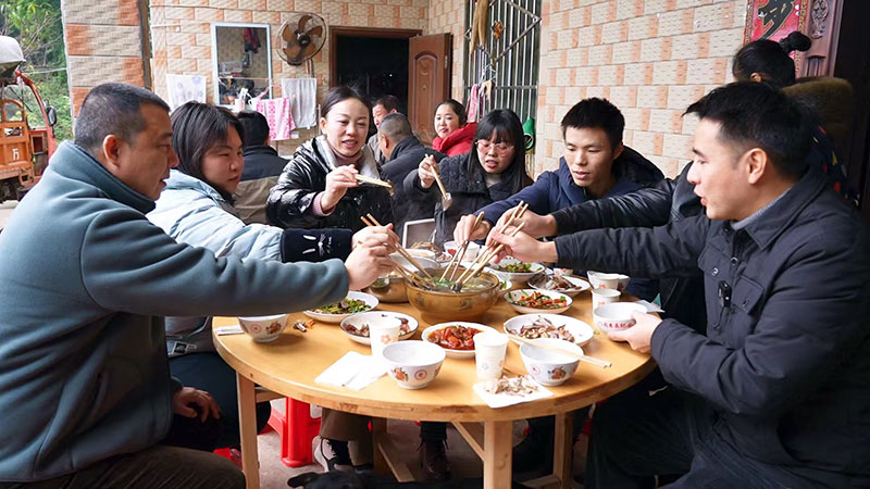 临近中午,重头戏——刨猪汤宴上演。一道道美味佳肴陆续上桌,王建和驻村工作队成员围坐席间热闹畅聊,过年的氛围弥漫其中。“现在路修好了,天然气也通了,自来水也要入户了,我们的生活真是越来越方便,相信明年的日子一定会更兴旺!”脱贫户王建吃着热乎的猪血旺,笑容满面地说道。