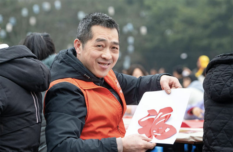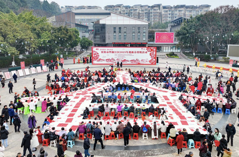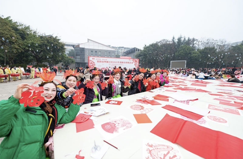 妙手剪春,祝福厚重。1月23日,雁江区三贤文化公园里,在资阳市暨雁江区2025年迎新春剪纸活动中,千余名市民用座位拼成一个巨型“春”字,大家和东峰剪纸代表性传承人刘绪阳一起,用一张张花样各异、造型独特的剪纸剪出浓浓年味。